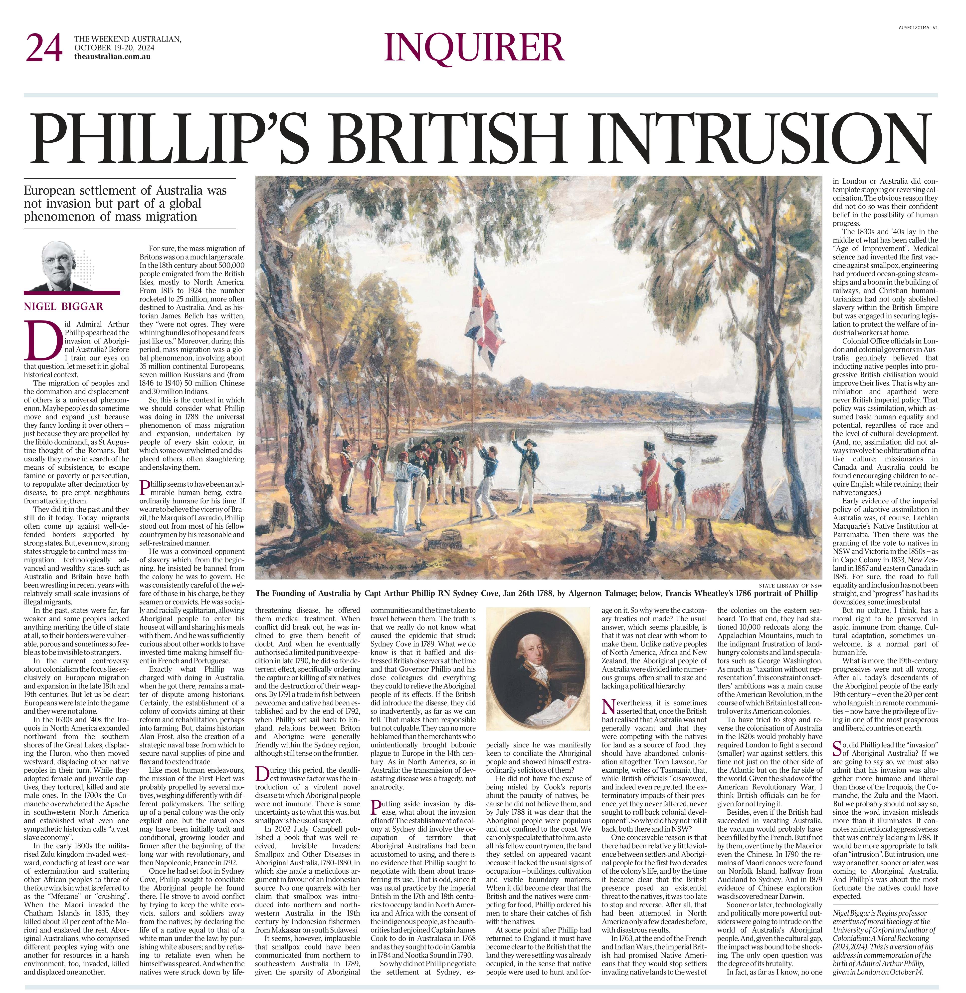 Did Admiral Arthur Phillip spearhead the invasion of Aboriginal Australia? While an annual commemoration of his birth rather implies not, many people now assume so. So, at this time, when colonialism has lately become a topic of hot public controversy in the United States, Canada, and Britain—in Australia and New Zealand, as you know, it has been a hot topic for decades—it seems fitting to address the question directly. Indeed, it would be odd not to.